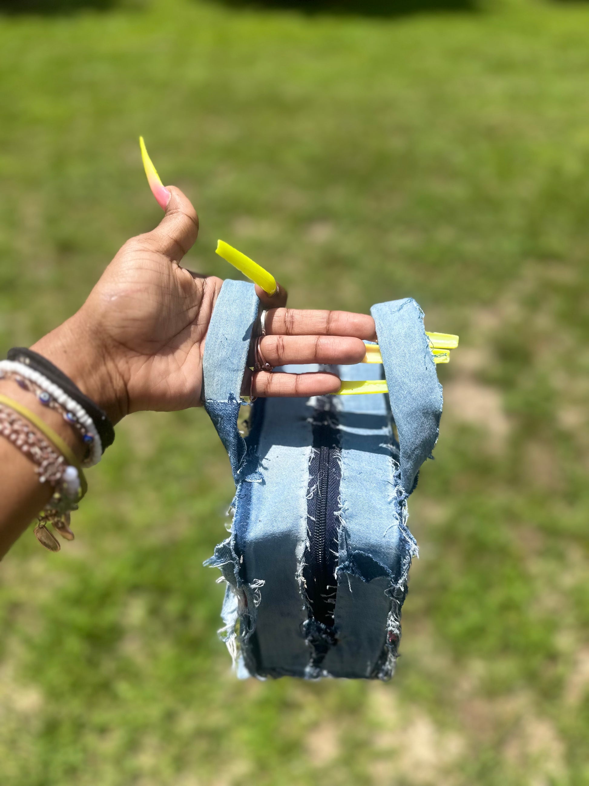 This compact, stylish tote features a zippered denim design that adds a touch of flair to any outfit.